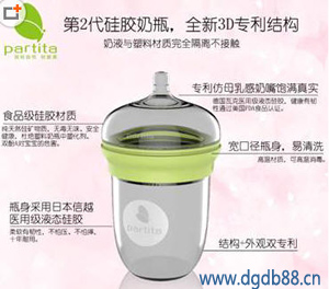 硅膠是一種材料,是一種能讓歐美等國家非常喜愛的材料,因?yàn)樵絹碓蕉嗟漠a(chǎn)品開始選擇用這樣的材料開始生產(chǎn),比如說硅膠奶瓶;硅膠奶嘴;圍兜等,最近就有一款新上市的奶瓶“partita” 這款產(chǎn)品是純硅膠打造,瓶身是高透明硅膠材質(zhì),瓶蓋和奶頭也是硅膠透明材質(zhì),從上倒下,看起來更像是一個可愛的寶寶,既然是高透明的硅膠生產(chǎn),那么產(chǎn)品100%是過食品級FDA認(rèn)證,不管是經(jīng)過多少度的高溫開水,都不會釋放出有害物質(zhì),這款硅膠奶瓶是由加拿大布迪家居開發(fā)生產(chǎn)。從硅膠本身的特性來說,硅膠是一種無色;無味;無毒的天然合成物質(zhì)。