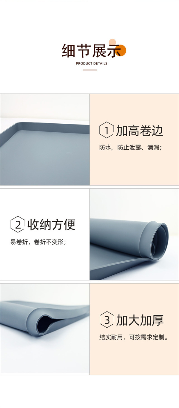 硅膠水槽墊可以在多個不同環(huán)境情況下正常使用,產(chǎn)品不僅可以用于下水槽隔水使用,也可以用于家居防滑腳墊以及廚房洗手臺物品收納擺放作用,硅膠材質(zhì)特性特殊,具備一定的防滑效果和隔熱功能,外圍一圈為擋墻,可以戶外進行物品擺放以及高低溫存放,便于收納以及折疊攜帶等