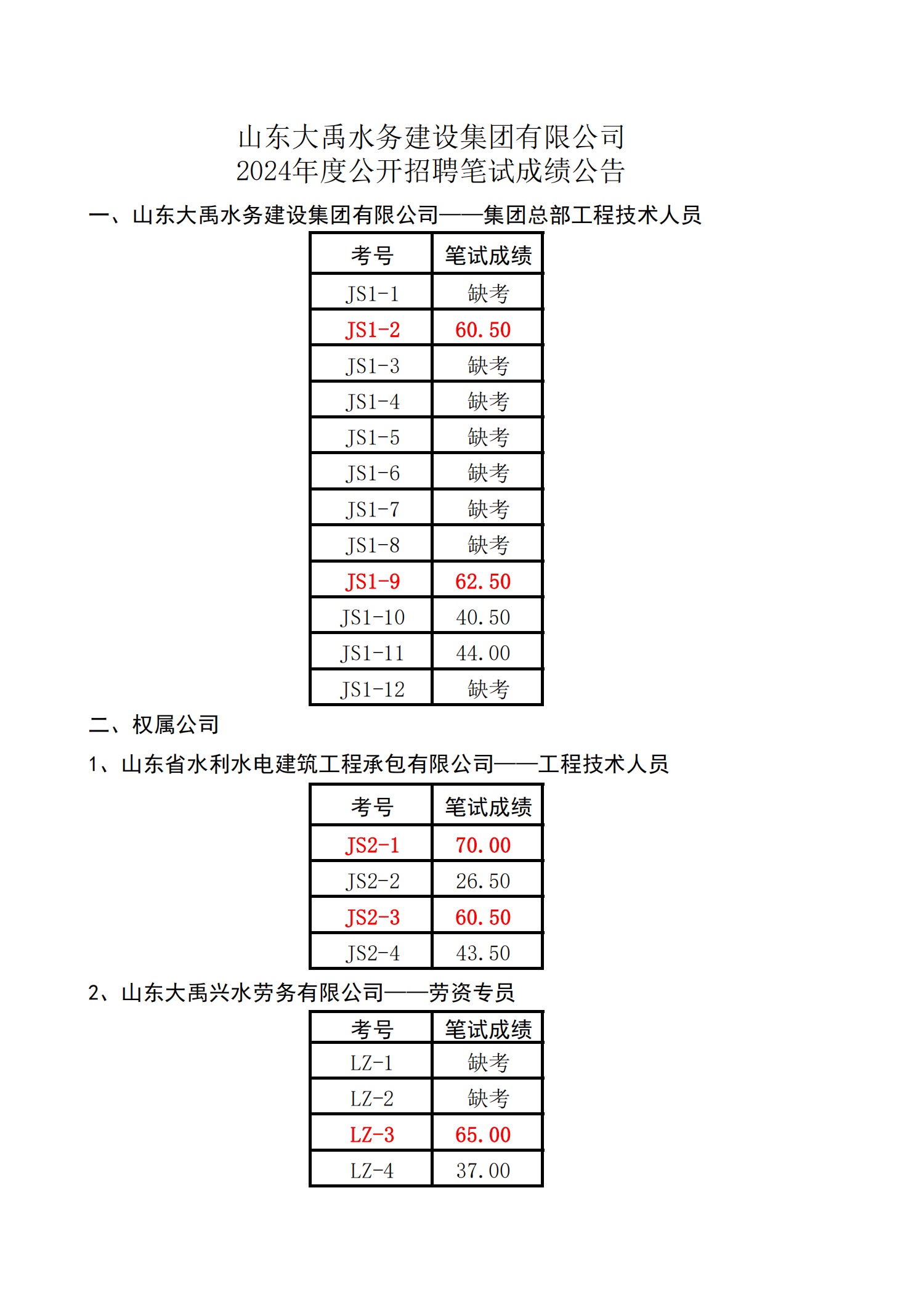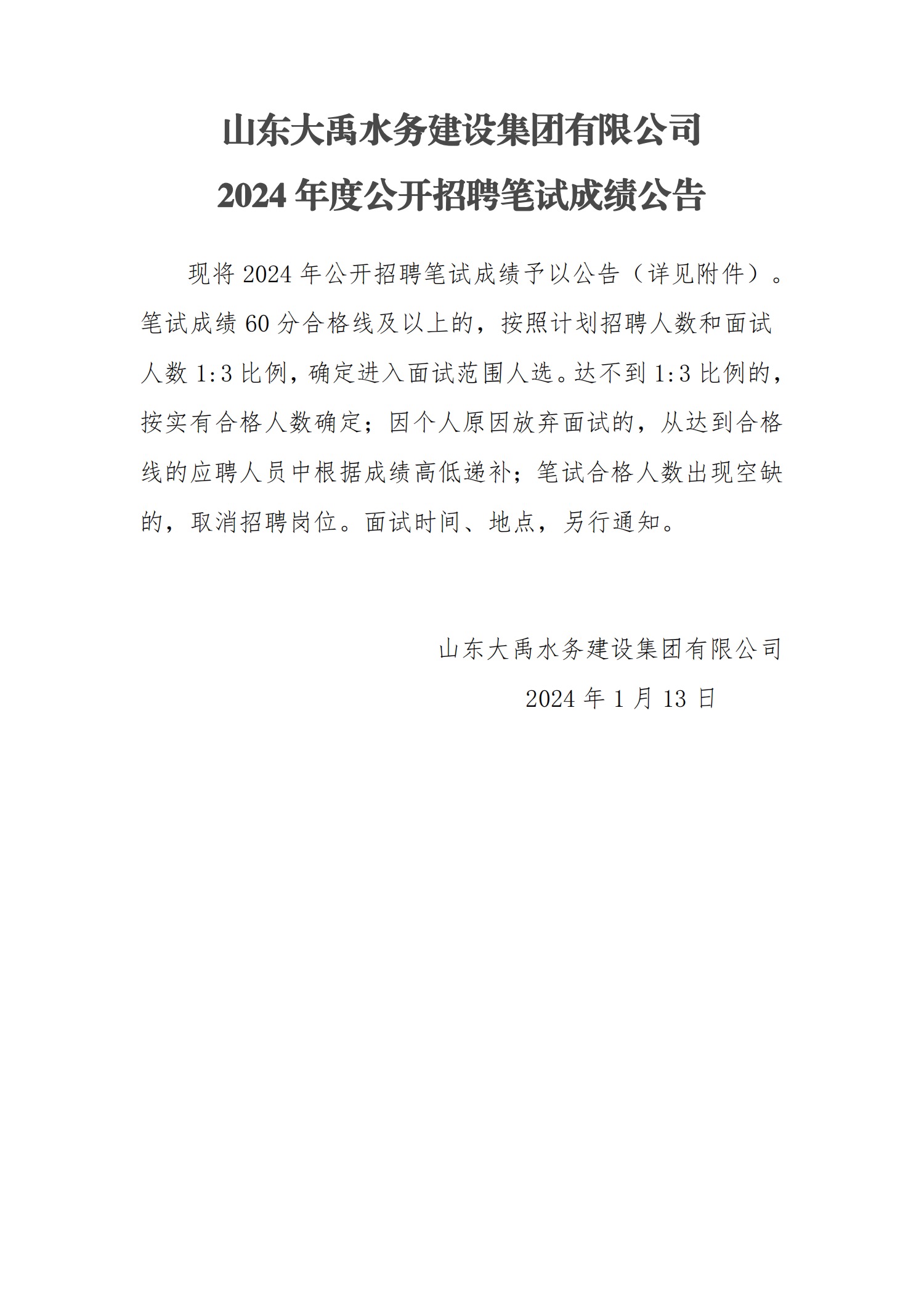 山東大禹水務建設集團有限公司2024年公開招聘考試成績公告