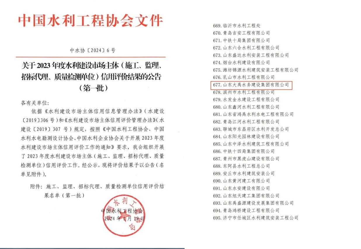 近日,中國水利工程協(xié)會(huì)發(fā)布《關(guān)于2023年度水利建設(shè)市場(chǎng)主體信用評(píng)價(jià)結(jié)果的公告》,山東大禹水務(wù)建設(shè)集團(tuán)有限公司獲評(píng)“2023年度水利建設(shè)市場(chǎng)主體施工信用評(píng)價(jià)AAA級(jí)企業(yè)”。