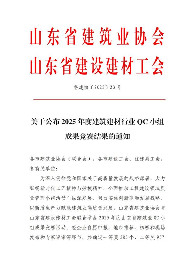 近日,山東省建筑業(yè)協(xié)會(huì)公布2025年度建筑建材行業(yè)QC小組成果競(jìng)賽結(jié)果,集團(tuán)公司申報(bào)的“提升混凝土廊道施工外觀優(yōu)良率”等6項(xiàng)成果經(jīng)過(guò)申報(bào)、地市推薦、初賽、現(xiàn)場(chǎng)發(fā)布和專家評(píng)審等環(huán)節(jié),1項(xiàng)榮獲一等獎(jiǎng)成果,5項(xiàng)榮獲二等獎(jiǎng)成果。