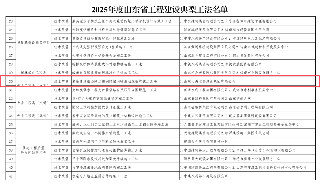 近日,山東省住房和城鄉建設廳公布了2025年度山東省工程建設工法名單。集團公司申報的《復雜陡坡組合降水槽鋼腰梁網噴泵站深基坑施工工法》《復雜曲形坡面逆序現澆格梗預制混凝土聯鎖塊護坡施工工法》通過評審,獲評2025年度山東省工程建設工法,其中《復雜陡坡組合降水槽鋼腰梁網噴泵站深基坑施工工法》榮獲典型工法。