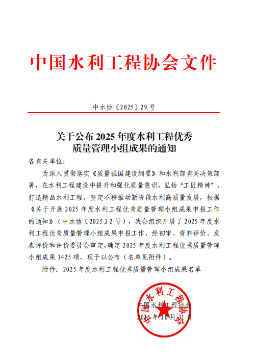 近日,中國水利工程協(xié)會(huì)公布了“2025年度水利工程優(yōu)質(zhì)質(zhì)量管理小組”評(píng)審結(jié)果,集團(tuán)公司申報(bào)的“提高波浪樁施工驗(yàn)收一次合格率”等六項(xiàng)成果經(jīng)過了初審、資料評(píng)價(jià)、發(fā)表評(píng)價(jià)和評(píng)審委員會(huì)審定,最終全部上榜。其中,3項(xiàng)成果榮獲I類成果,1項(xiàng)成果榮獲Ⅱ類成果,2項(xiàng)成果榮獲III類成果。